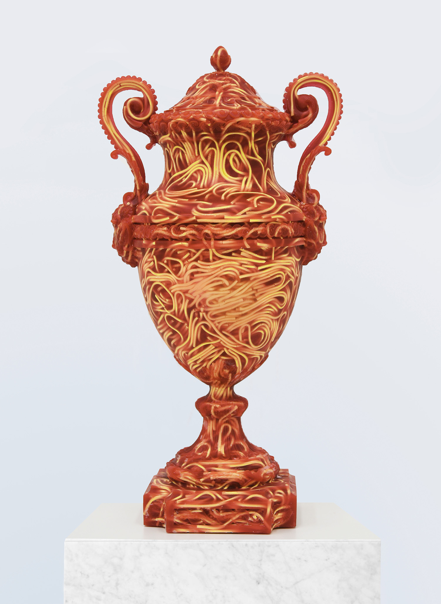 Adam Parker Smith, Louis XVI Vase, 2021. Resin, polymer clay, Vase: 24 x 8 x 7 inches, 61 x 20 x 18 cm. Pedestal: 32 x 12 x 12 inches, 81 x 31 x 31 cm. Edition of 5, 1AP.