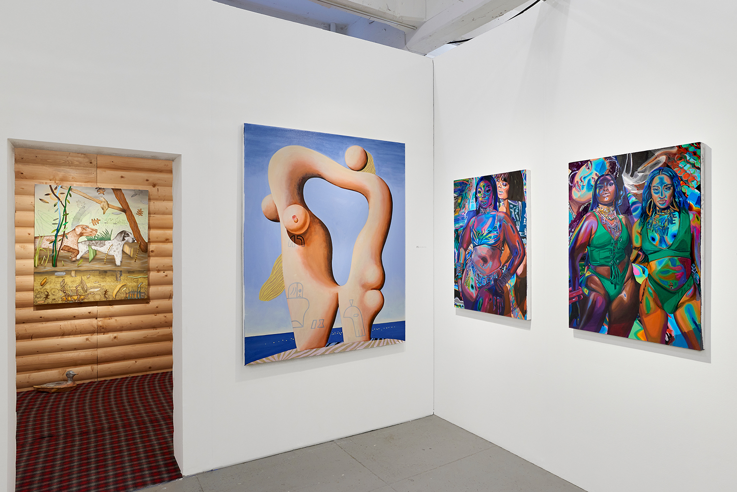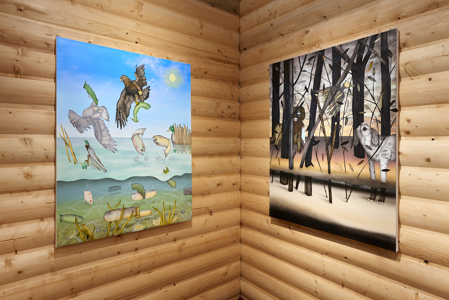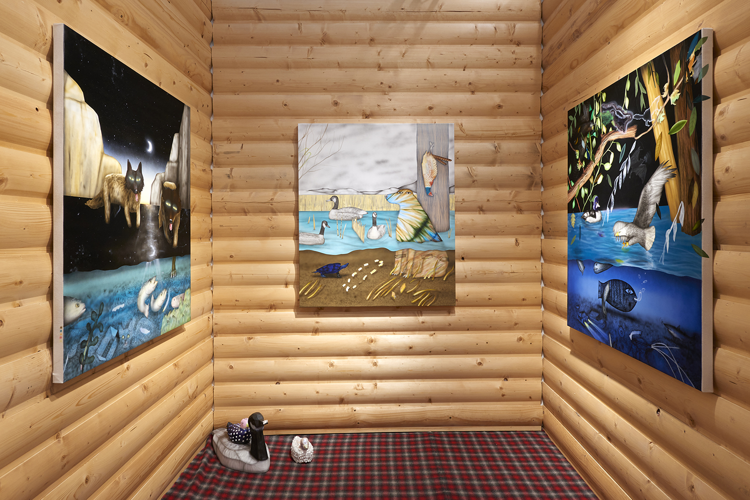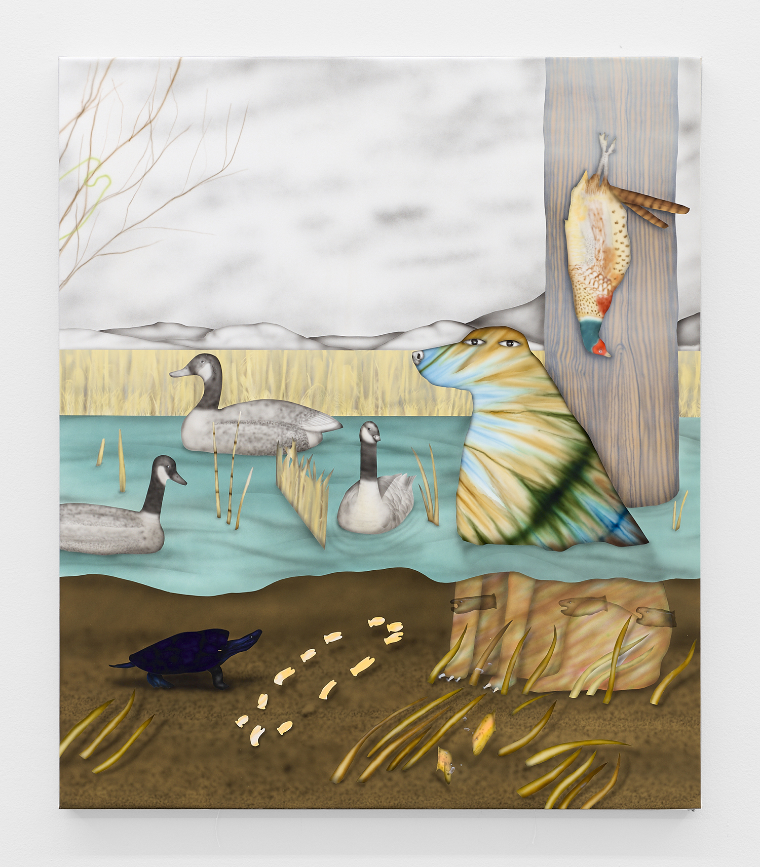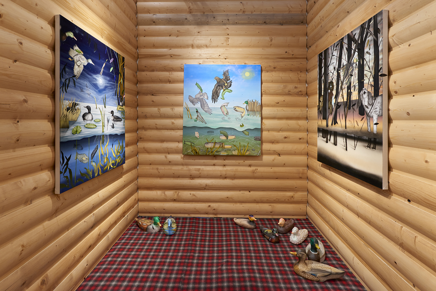 The Hole is proud to announce our participation in NADA New York. Please visit us at Booth 3.12 on the 3rd floor for an immersive hunting cabin installation featuring paintings by Matt Belk. Working in acrylic on canvas, Matt Belk’s paintings reconsider rural scenes of game-hunting in the American landscape. In our little cabin we present seven scenes of fish, fowl and canine: like Courbet’s handsome and vicious hounds, Belk’s own dogs chase duck, pheasant and salmon through wetlands and forests. The crispy digital-seeming method of painting and the uncanny gaze of Belk’s animals relegates the comfortable, nostalgic memories of an L.L. Bean-type outdoorsmanship to a bygone era.