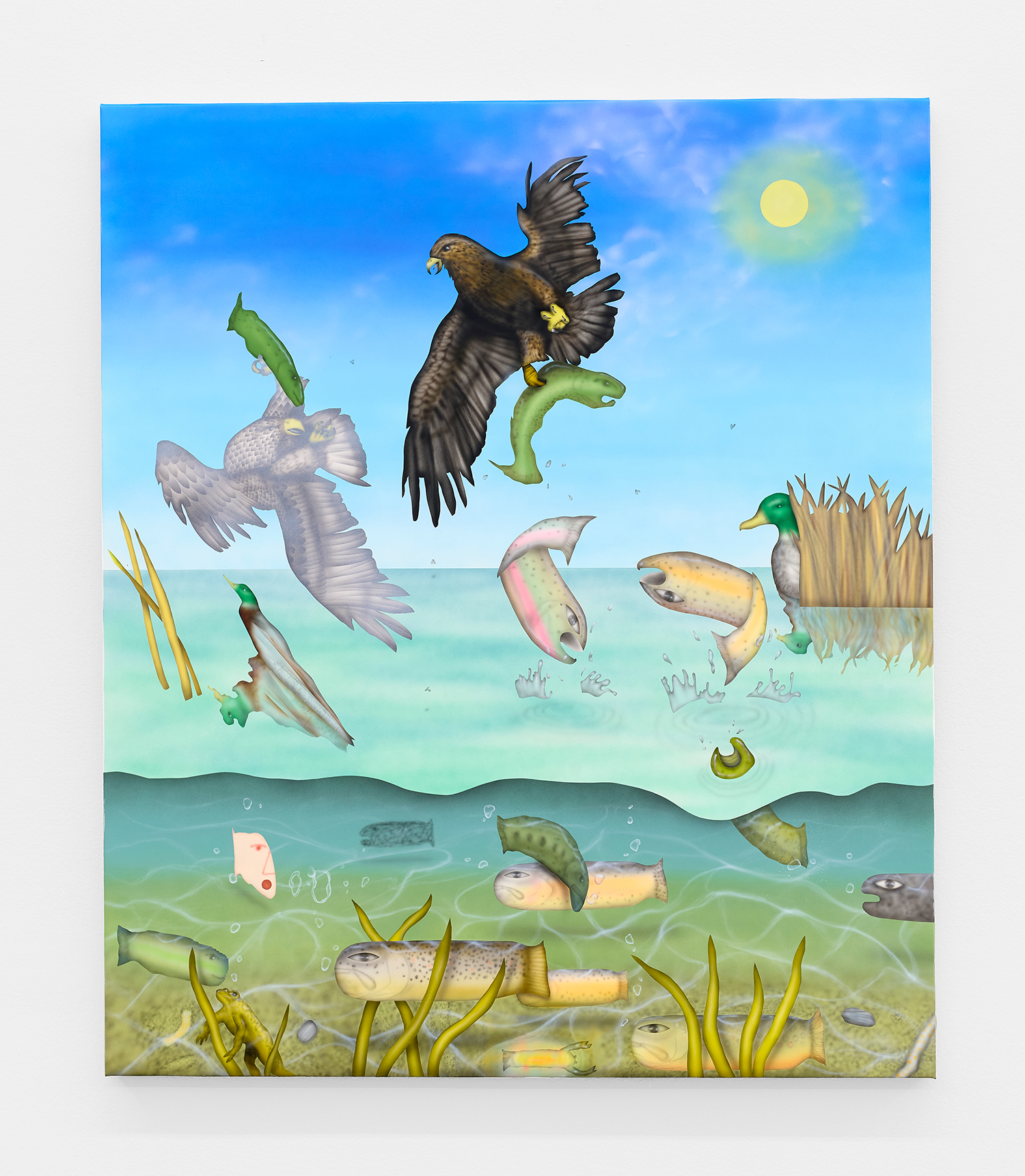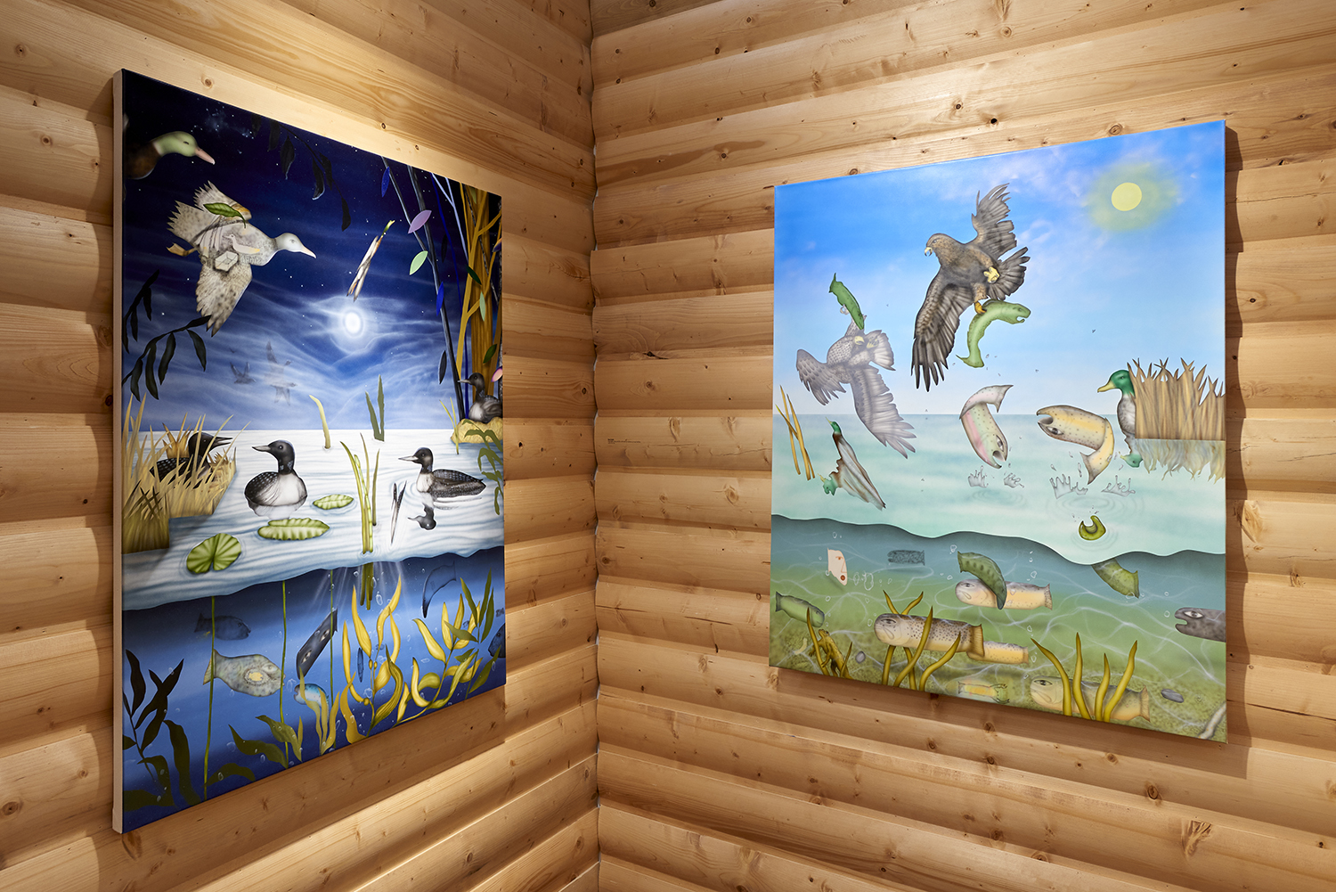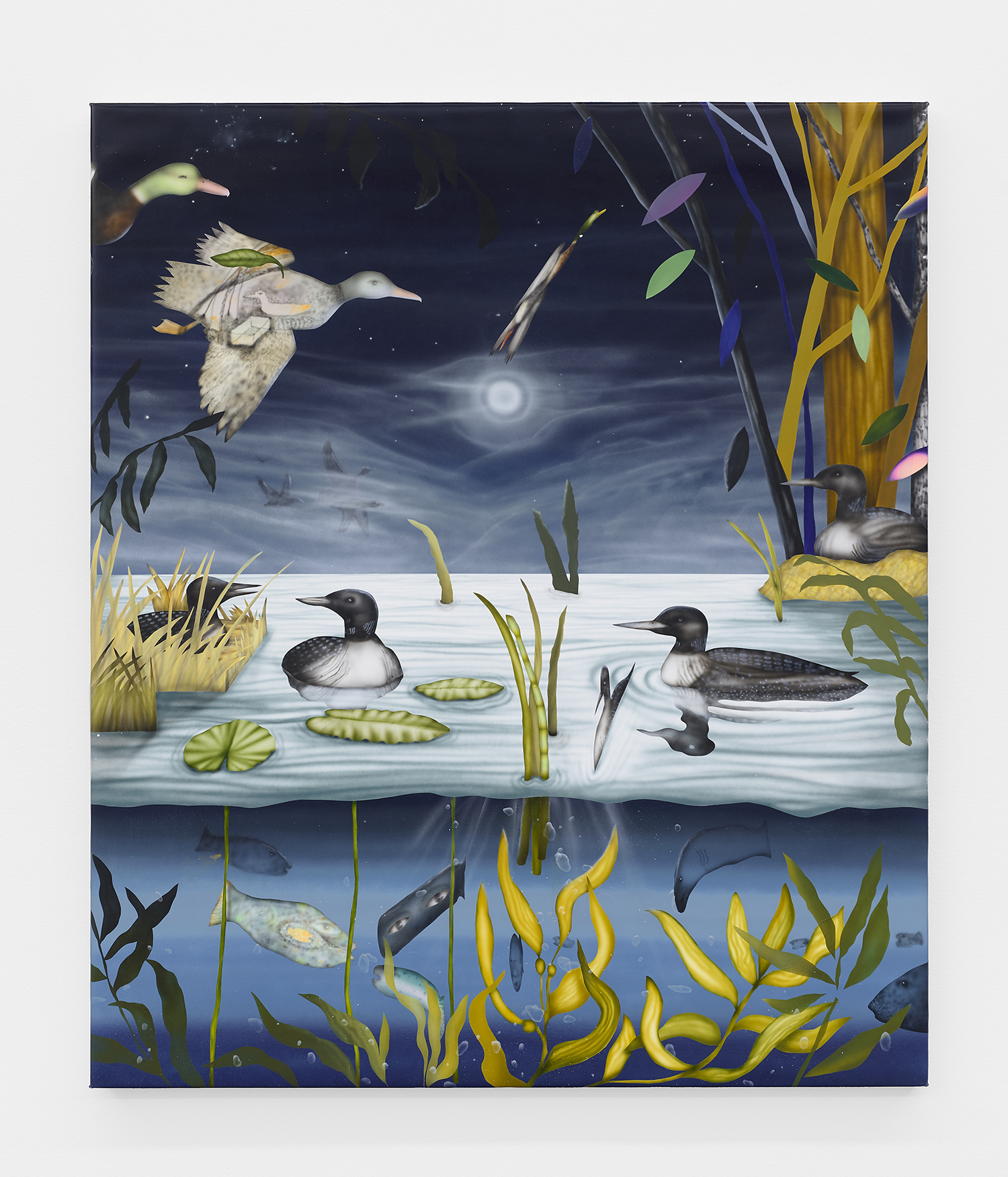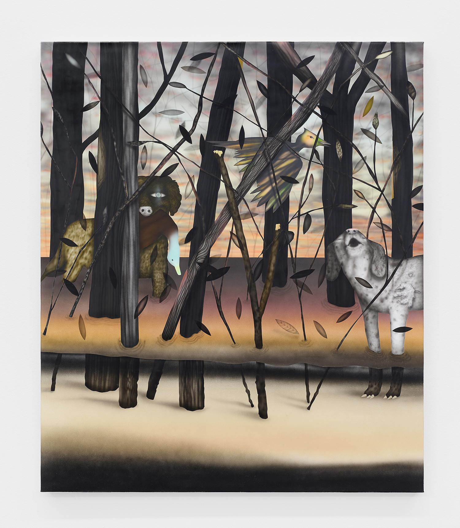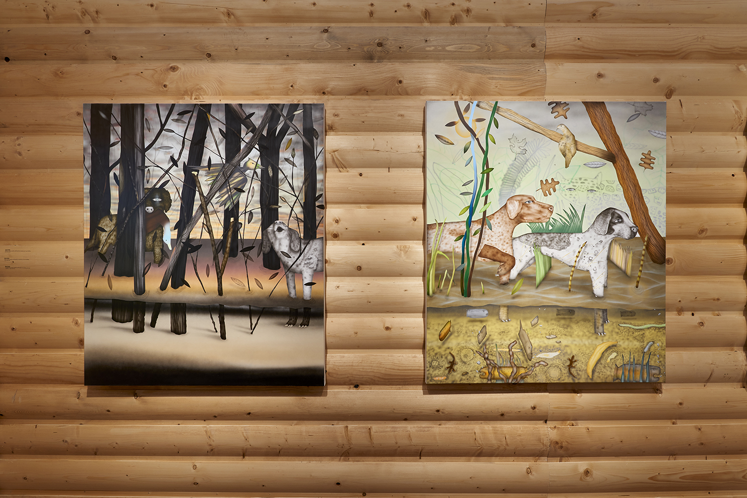The Hole is proud to announce our participation in NADA New York. Please visit us at Booth 3.12 on the 3rd floor for an immersive hunting cabin installation featuring paintings by Matt Belk. Working in acrylic on canvas, Matt Belk’s paintings reconsider rural scenes of game-hunting in the American landscape. In our little cabin we present seven scenes of fish, fowl and canine: like Courbet’s handsome and vicious hounds, Belk’s own dogs chase duck, pheasant and salmon through wetlands and forests. The crispy digital-seeming method of painting and the uncanny gaze of Belk’s animals relegates the comfortable, nostalgic memories of an L.L. Bean-type outdoorsmanship to a bygone era.