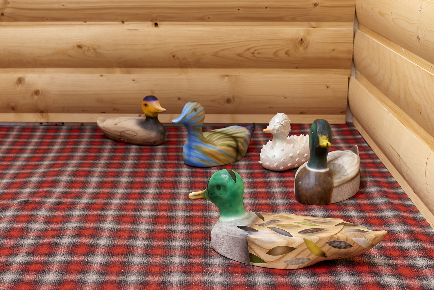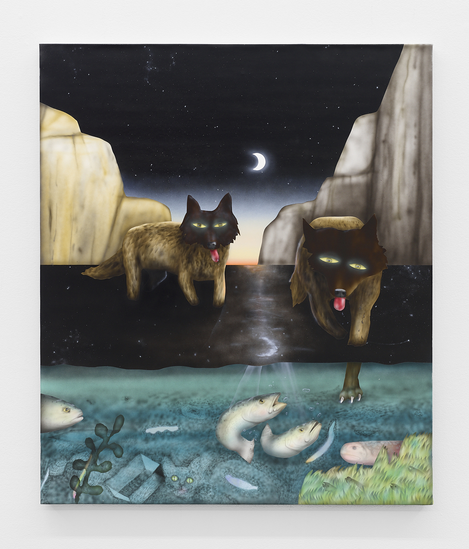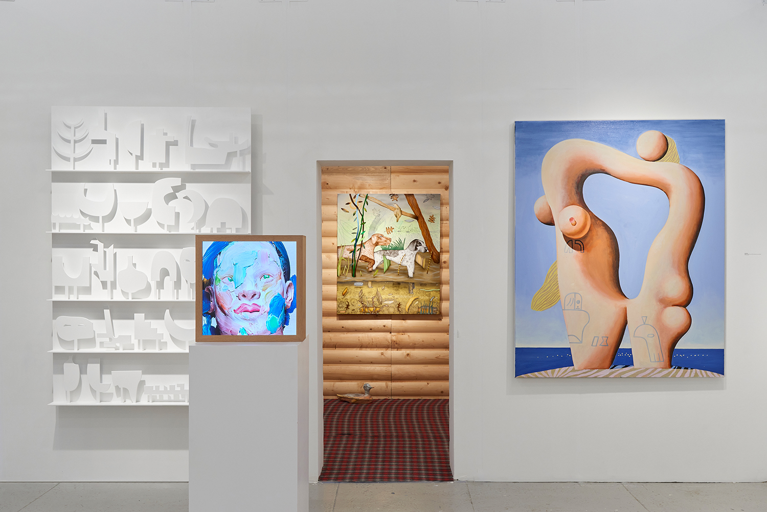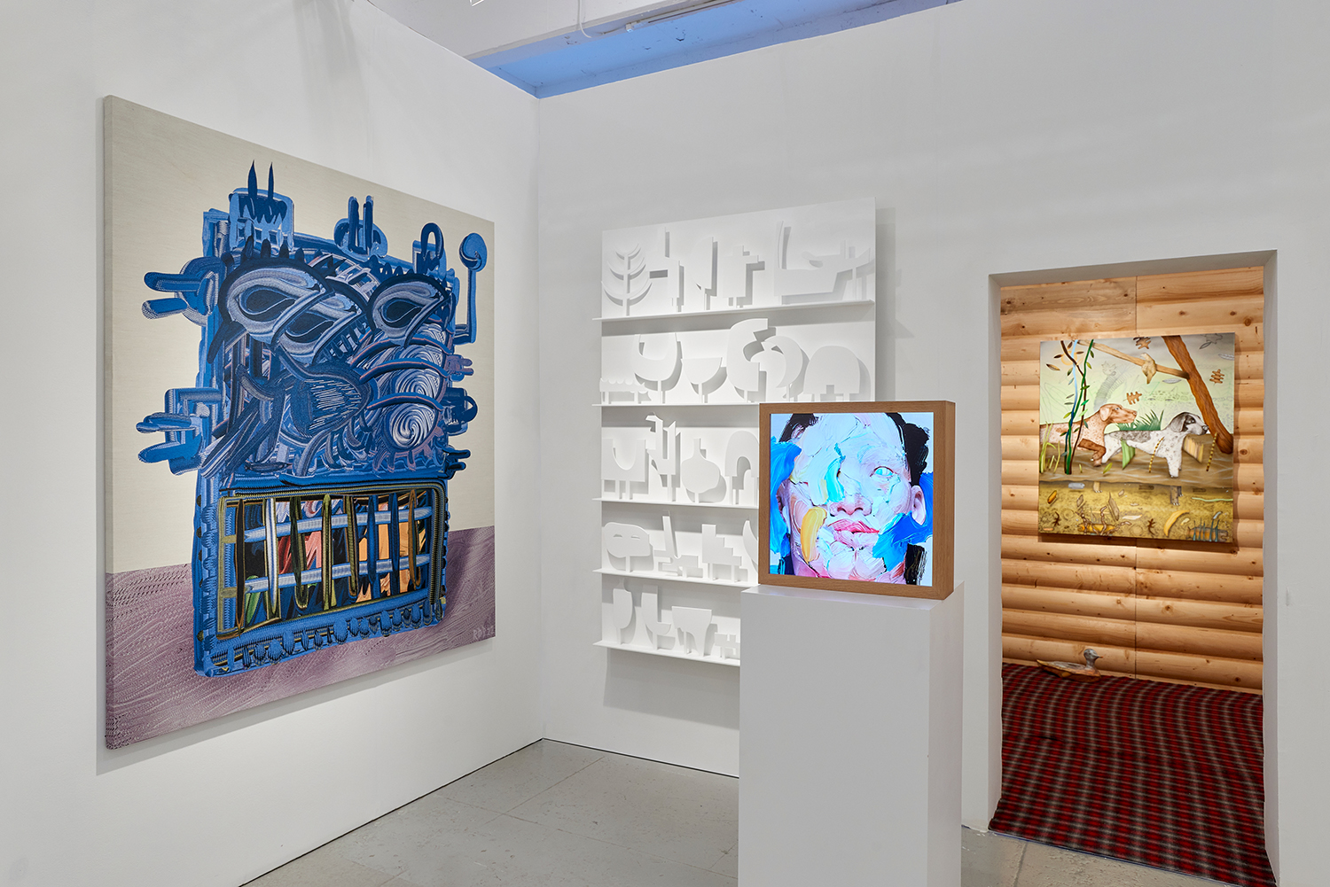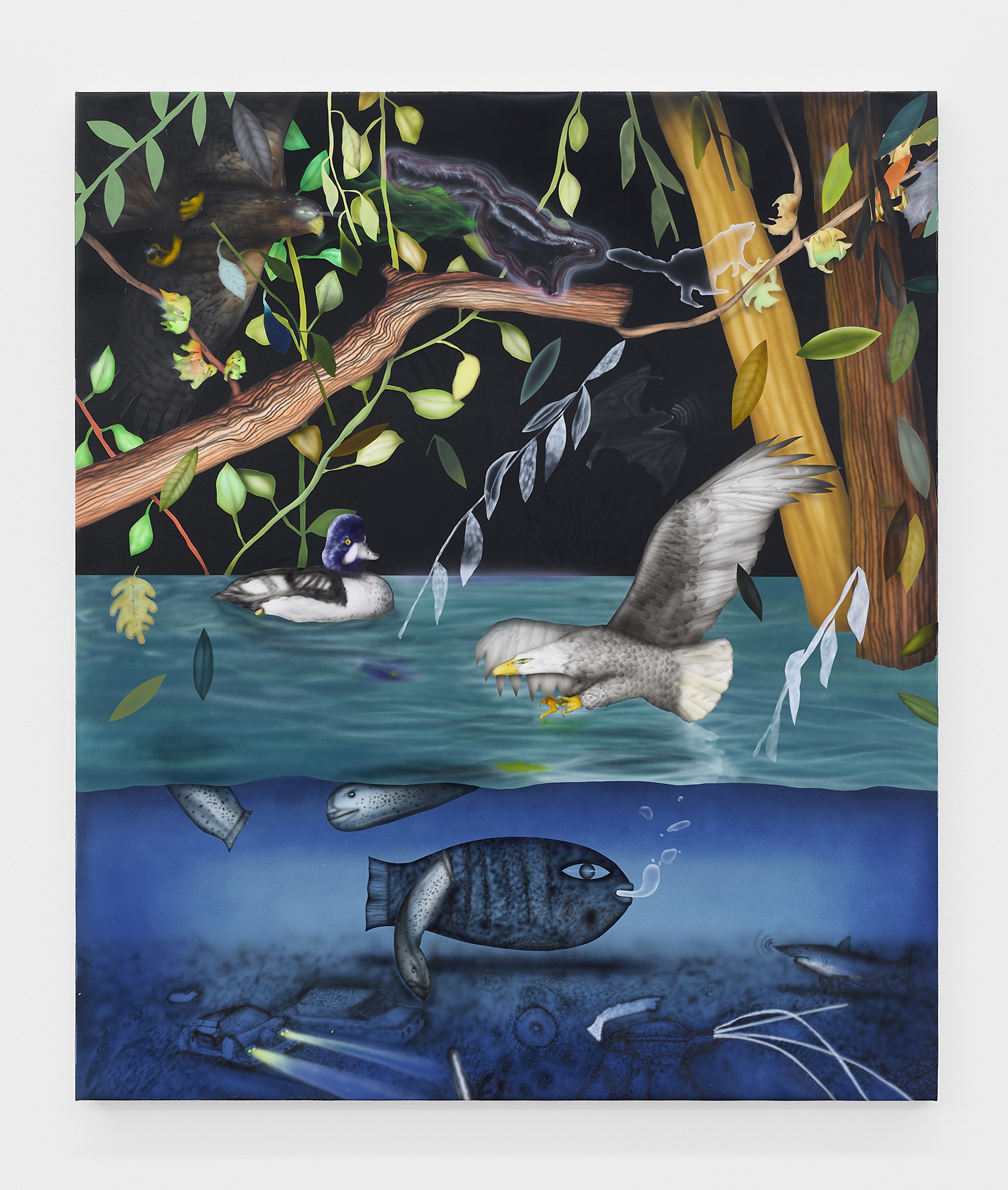 The Hole is proud to announce our participation in NADA New York. Please visit us at Booth 3.12 on the 3rd floor for an immersive hunting cabin installation featuring paintings by Matt Belk. Working in acrylic on canvas, Matt Belk’s paintings reconsider rural scenes of game-hunting in the American landscape. In our little cabin we present seven scenes of fish, fowl and canine: like Courbet’s handsome and vicious hounds, Belk’s own dogs chase duck, pheasant and salmon through wetlands and forests. The crispy digital-seeming method of painting and the uncanny gaze of Belk’s animals relegates the comfortable, nostalgic memories of an L.L. Bean-type outdoorsmanship to a bygone era.