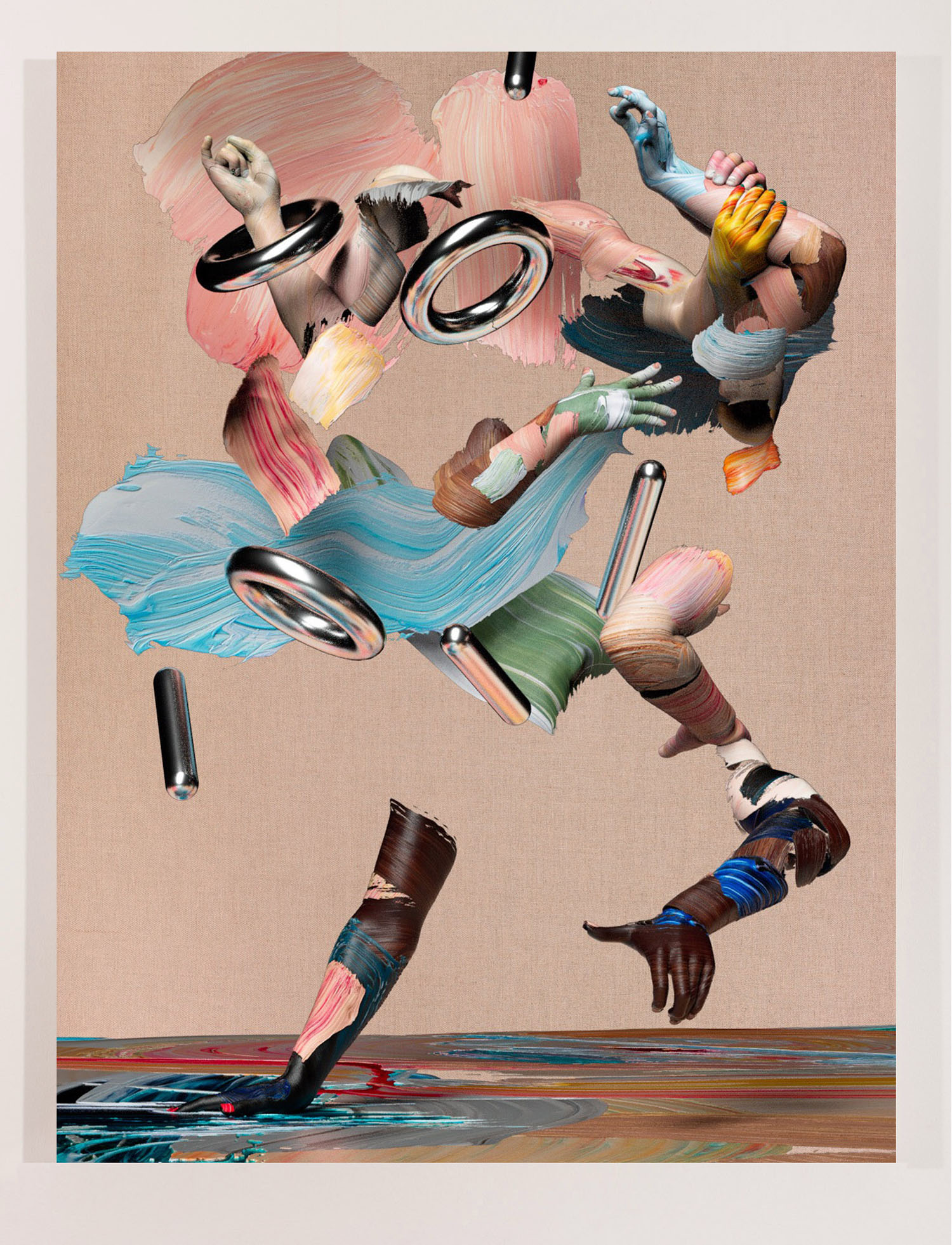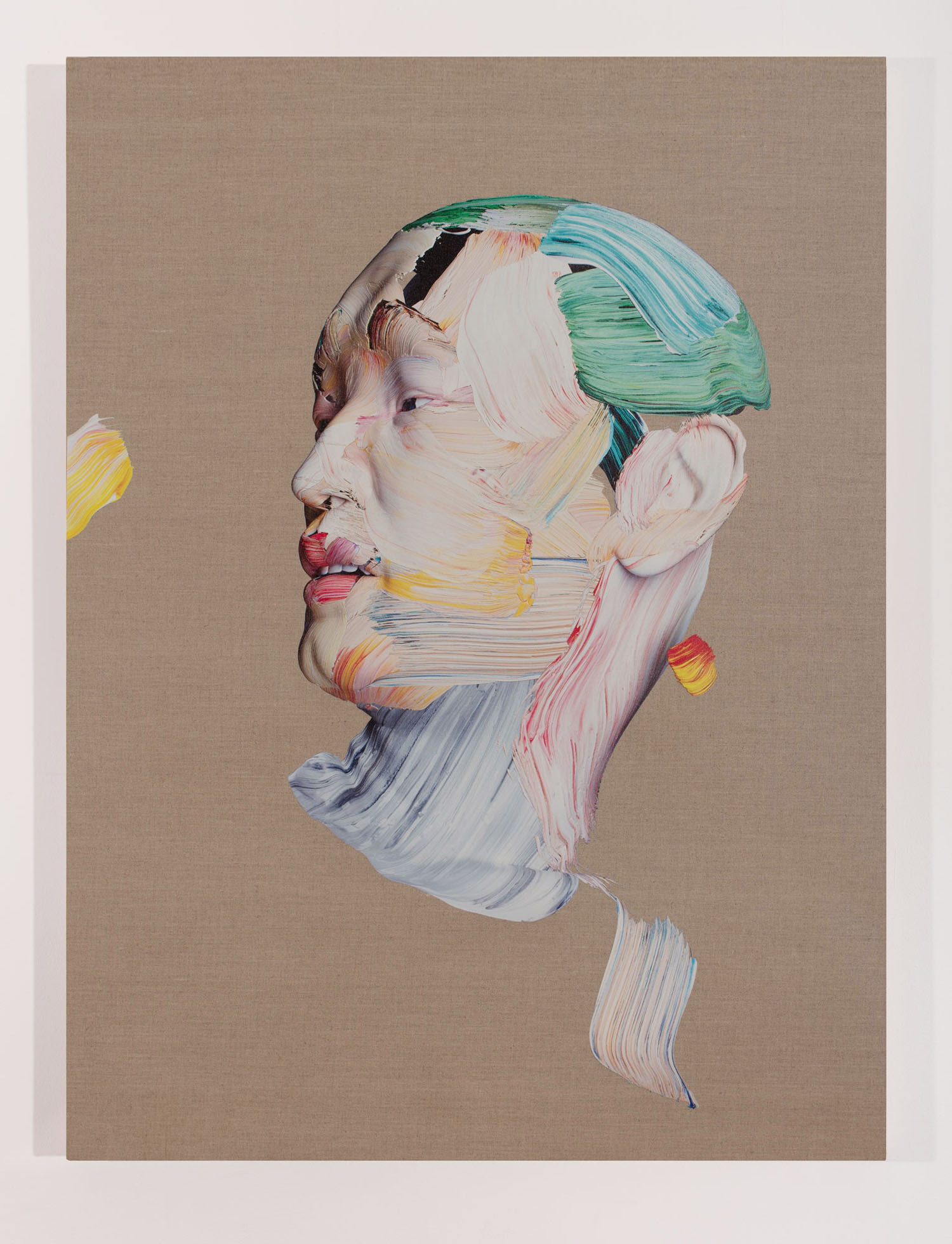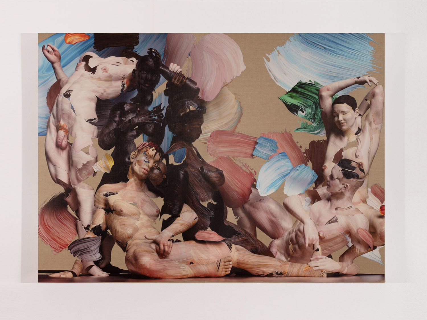 The new works use technology to break with the history of composing a painting on a flat surface, lifting the strokes into a virtual and free space. The addition of shadows and foreshortening creates an illusionistic – trompe l’oeil sense of depth and perspective within the canvases. The paintings show diverse bodies intertwined with each other and single figures gazing out at an unseen other. Diverting from his previous purely optimistic imaginings of neutral utopias, the work dramatizes the human need for interaction, touch, recognition, respect, and raises questions about independence and interdependency.