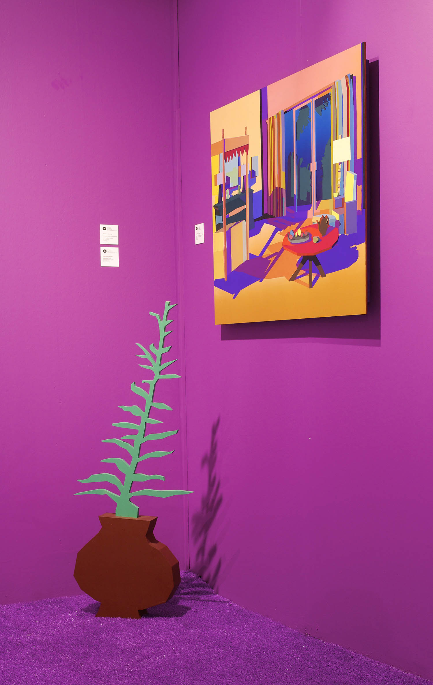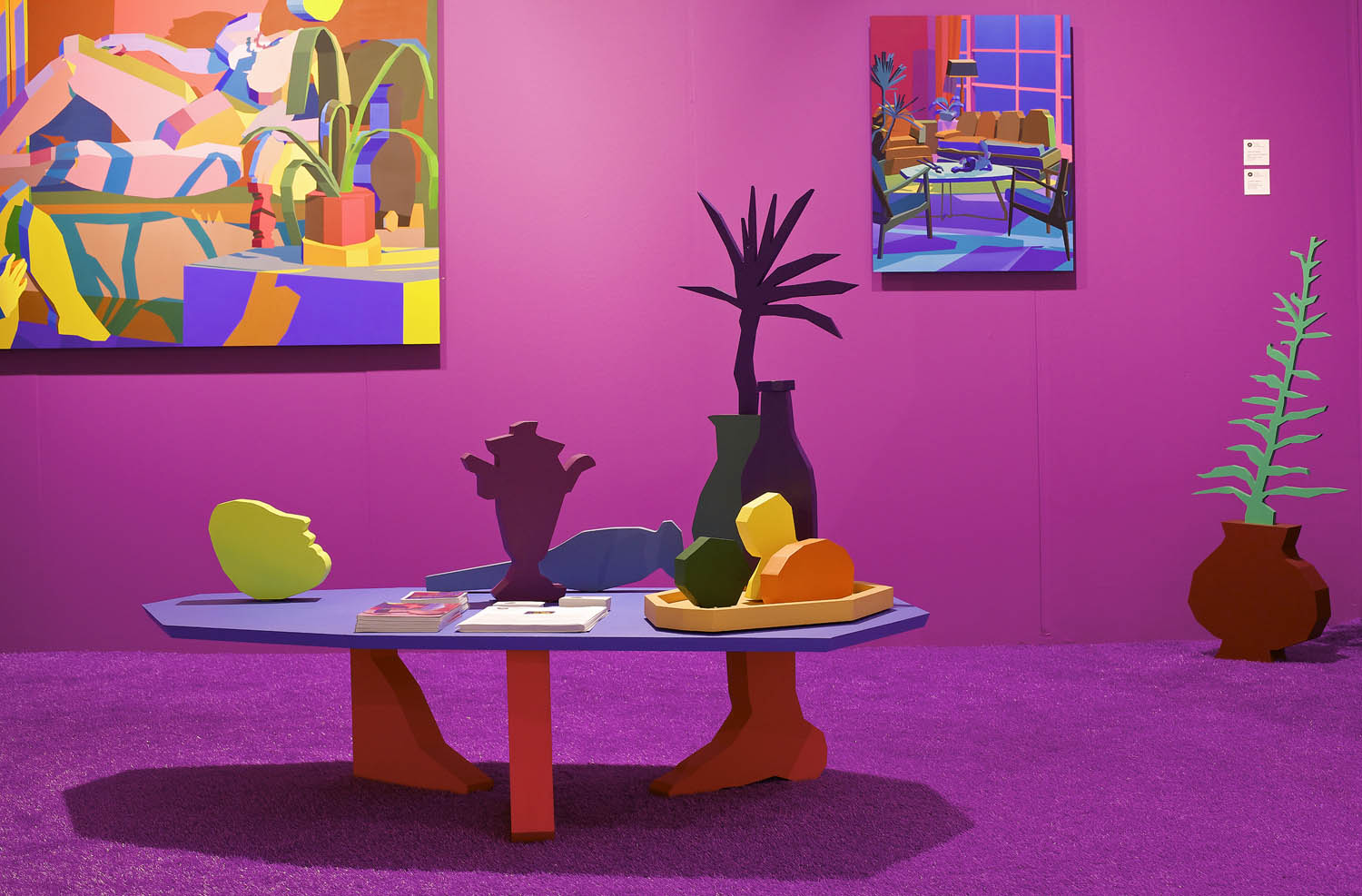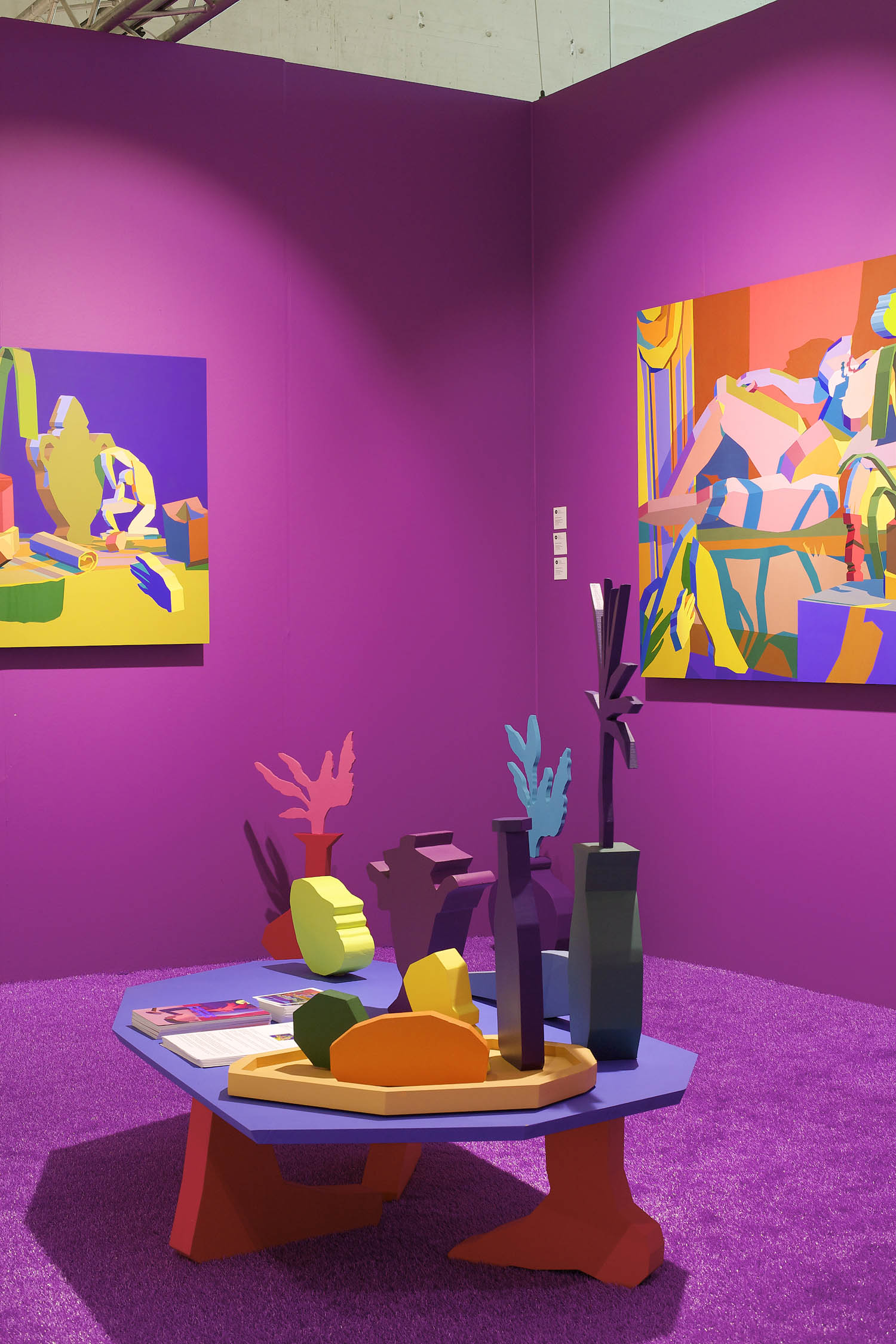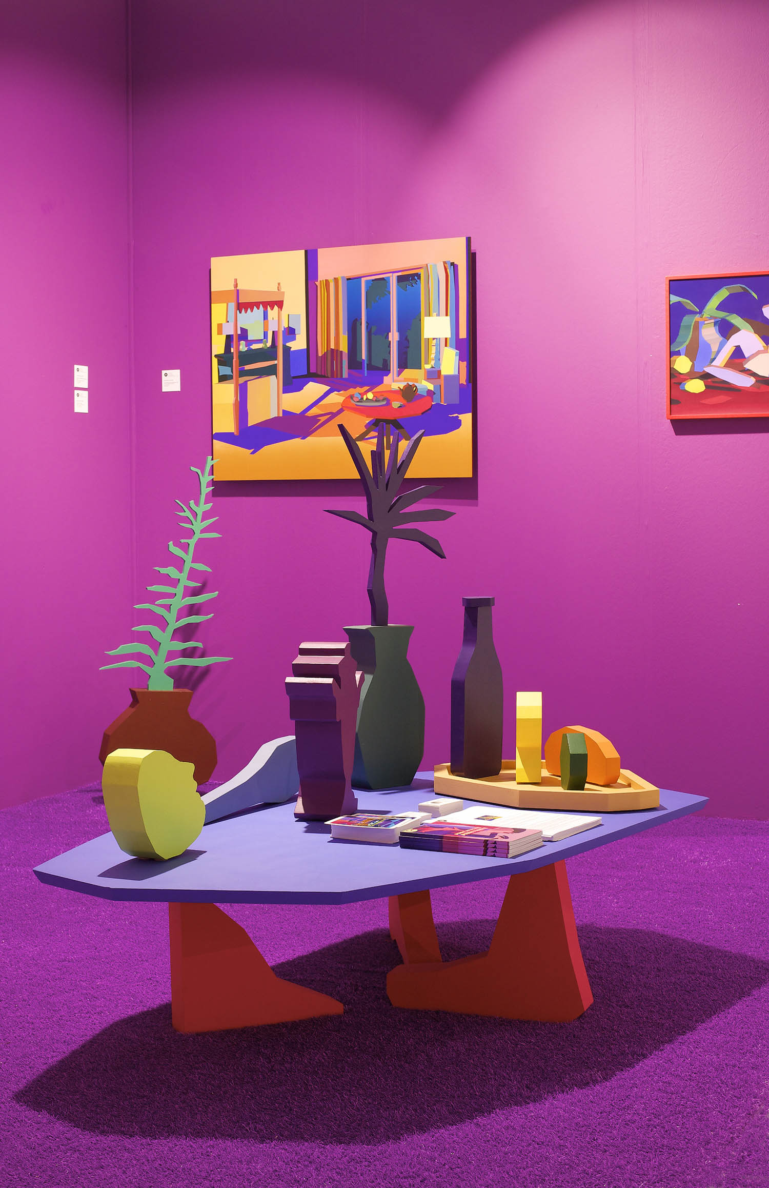 Pulling items out of the paintings and into the booth installation, Chapline executes a table of objects and three potted plants with CNC routed MDF sculpture in the same 2D-3D way. Visitors can experience the virtual space of his painted world by entering this violet environment.