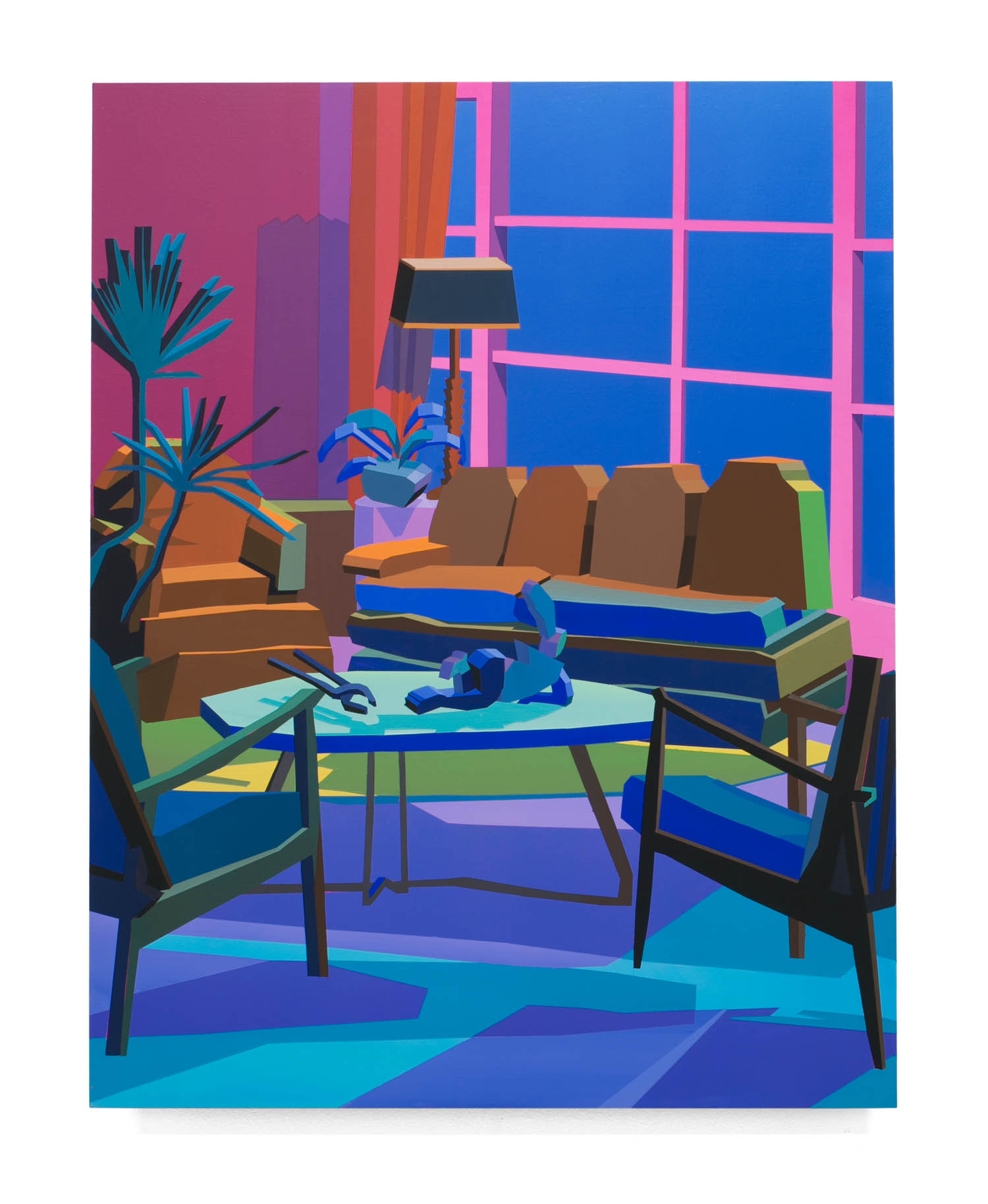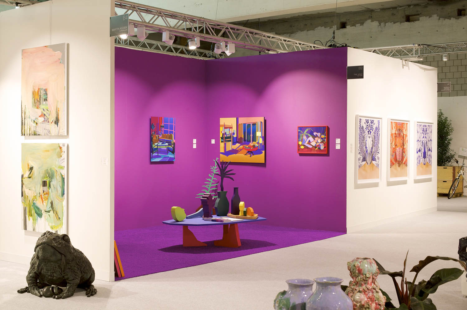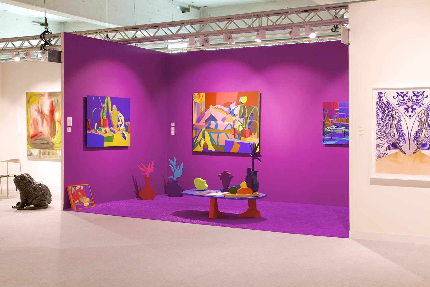 Pulling items out of the paintings and into the booth installation, Chapline executes a table of objects and three potted plants with CNC routed MDF sculpture in the same 2D-3D way. Visitors can experience the virtual space of his painted world by entering this violet environment.