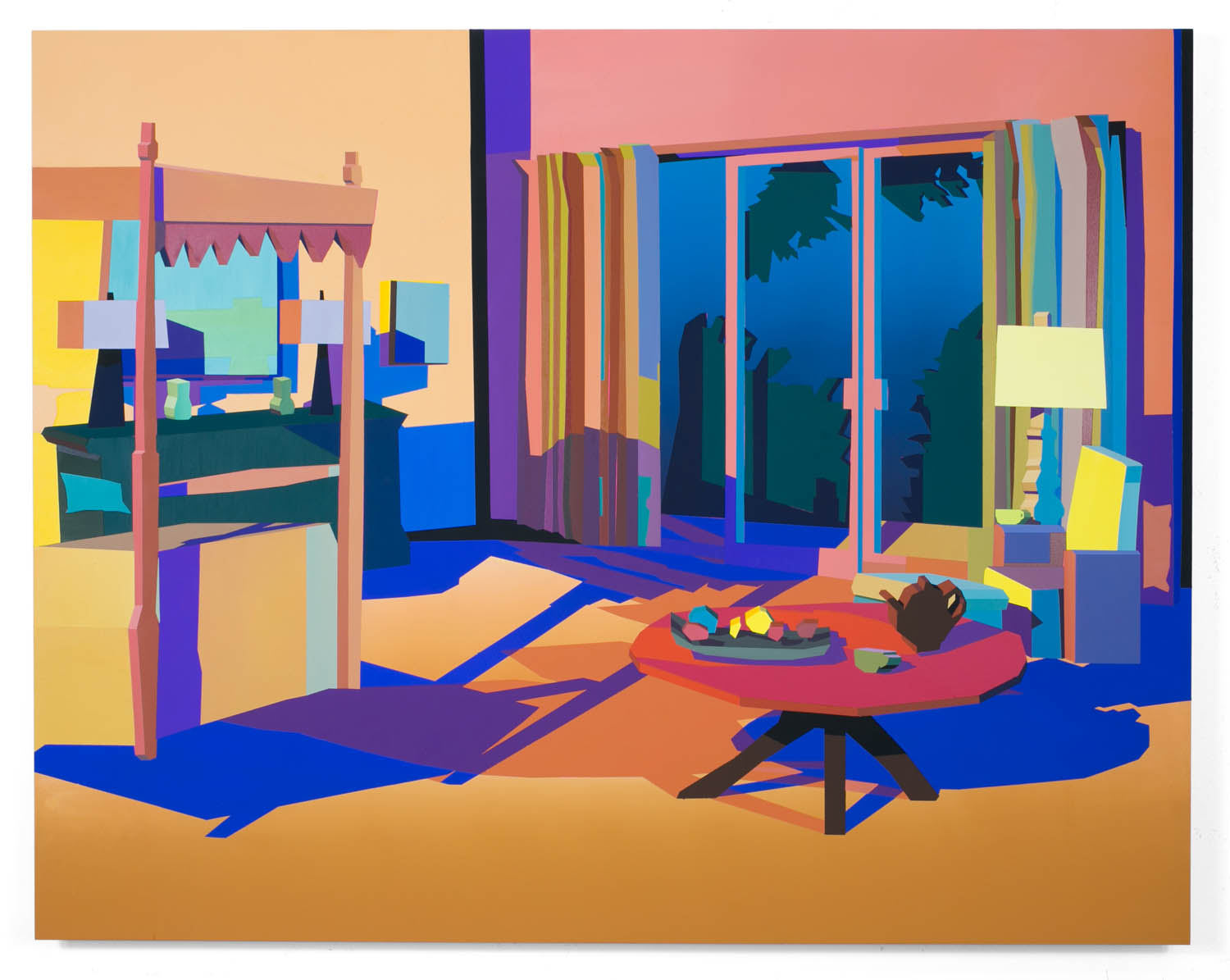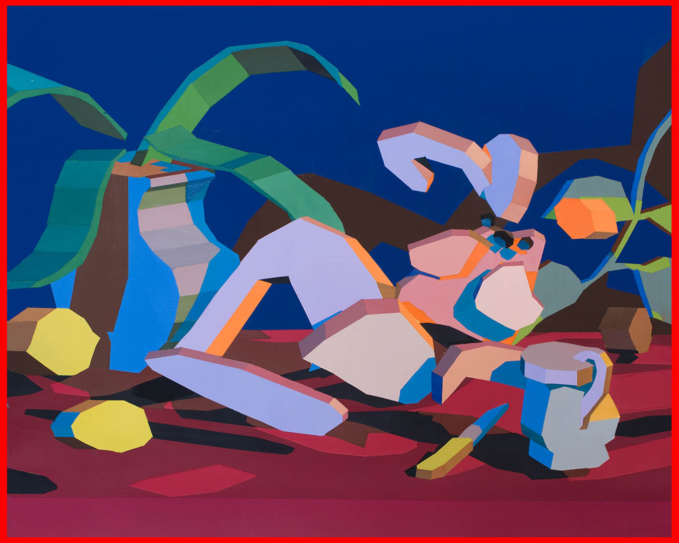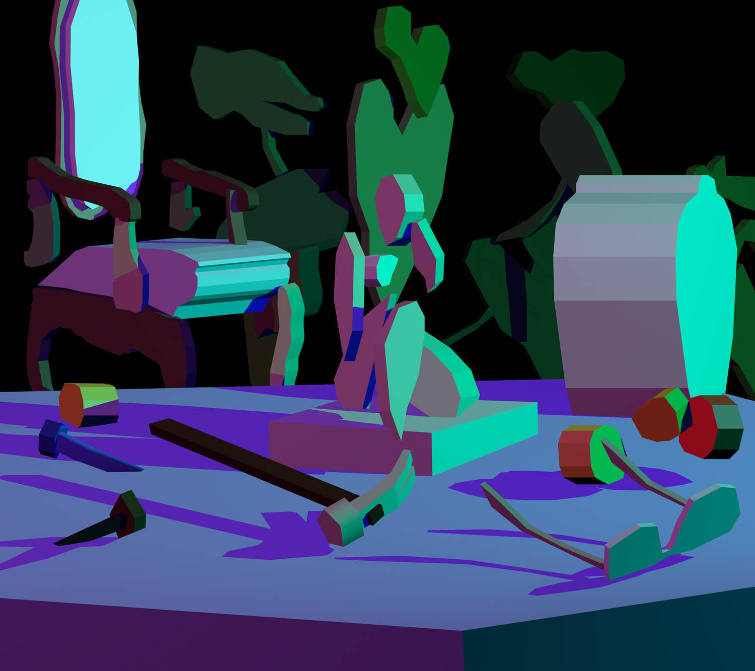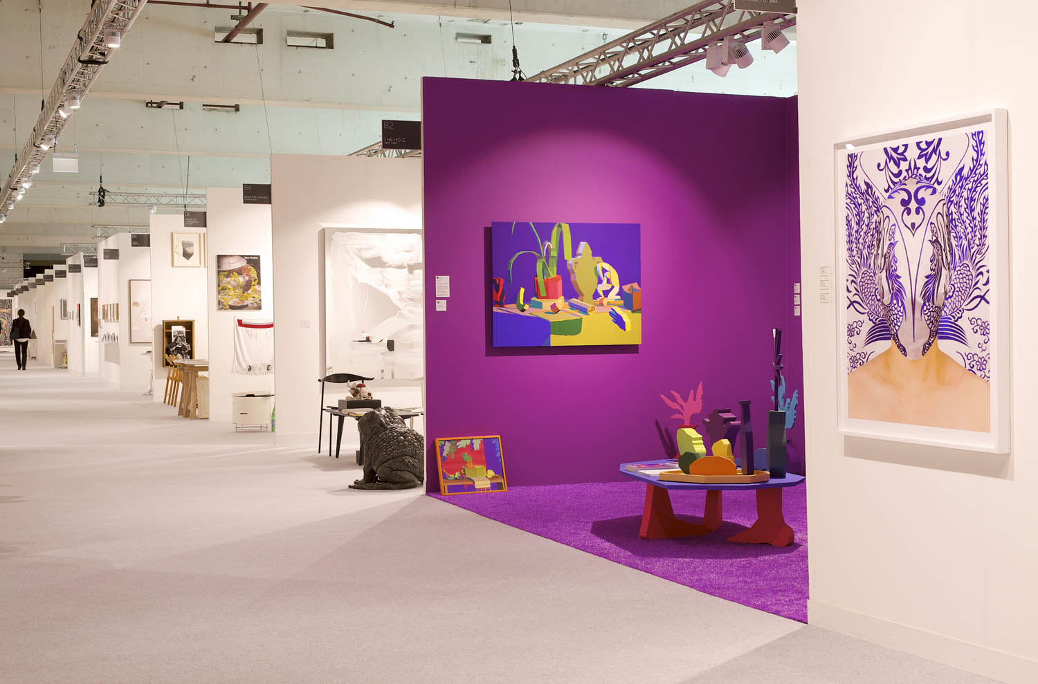 Pulling items out of the paintings and into the booth installation, Chapline executes a table of objects and three potted plants with CNC routed MDF sculpture in the same 2D-3D way. Visitors can experience the virtual space of his painted world by entering this violet environment.