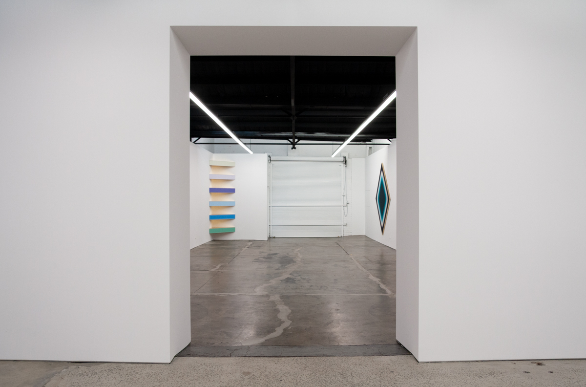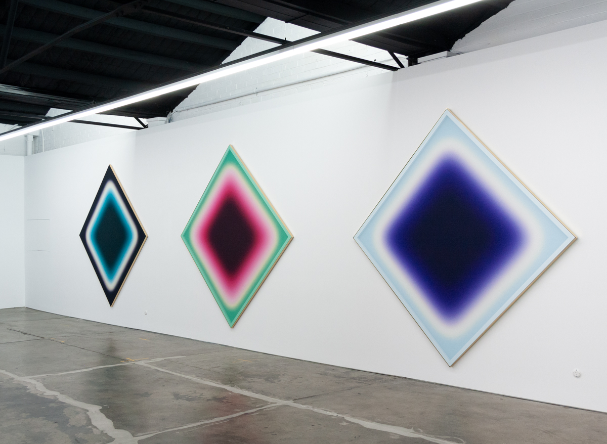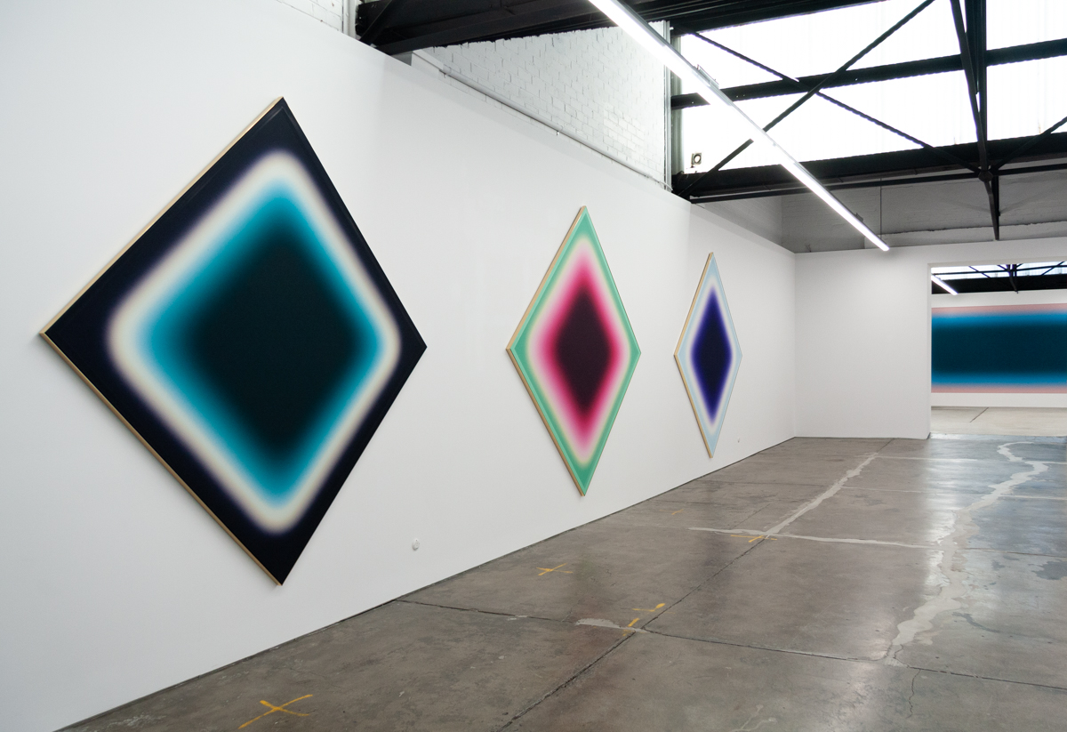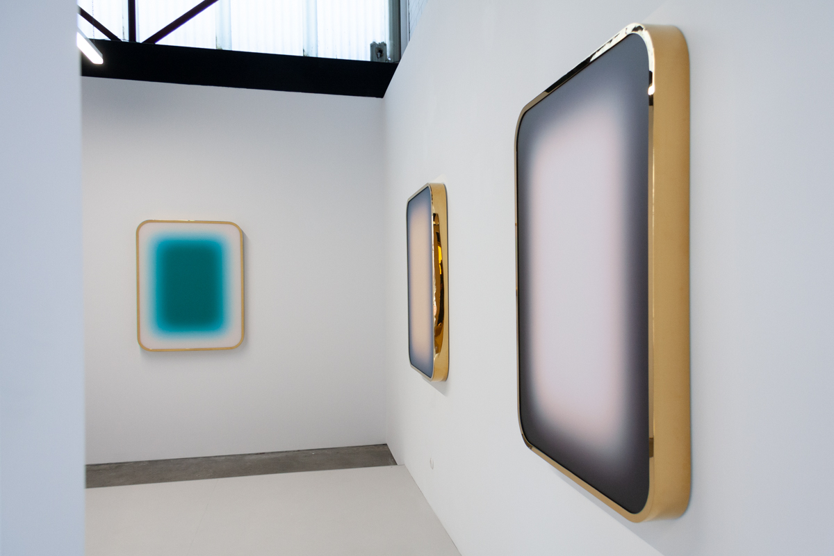 The gallery's front space sees a group of four large-scale works of multi-layered voile set in polished brass, this group of diamonds are created in vibrant colours merging and morphing into one another within each picture, a combination that reveals the familiar Nieschian effects of shimmer and moiré. This prismatic grotto is extended with a corner work representing a complex architecture of light, its angles reference the Donald Judd stack while firmly situated in a Euro discothèque, projections of softened pantone tones stagger between reflecting gold mirrors.
