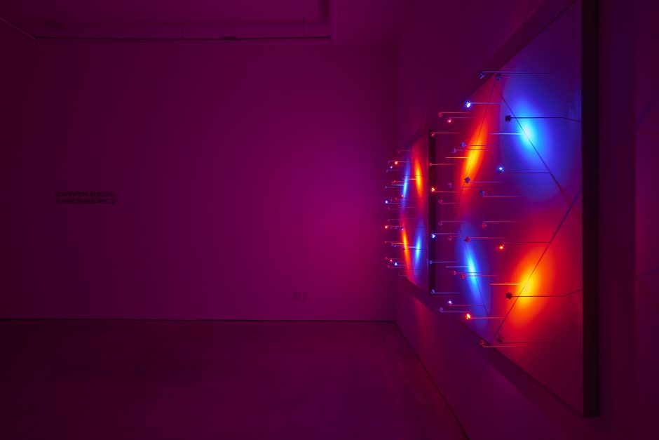 The work investigates emergence, the way complex systems and patterns arise out of a multiplicity of simple interactions. Each light panel consist of four dials with eight high-brightness LED-lights each. The eight LEDs of each dial are arranged equidistantly in a circle around a center pole. The LEDs point towards the pole casting its shadow. The lights of each dial are animated sequentially causing the shadows to rotate 360 degrees. Two of the LED dials per panel consist of alternating white and red LEDs. The other two LED dials consist of alternating white and blue LEDs. By off-setting the start of the dials or operating different dials at different speeds, synergy between the individual dials emerges and produces complex large-scale patterns.
