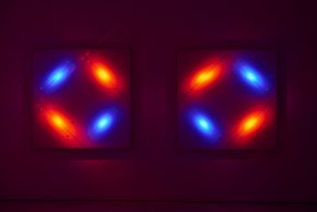 Dial White-Red White Blue (two panels), 2015, Two-panel light painting, each panel 16 white, 8 red, and 8 blue programmed LEDs on painted white board framed in stainless steel, each panel: 58 x 58 x 10 inches, 147 x 147 x 24 cm